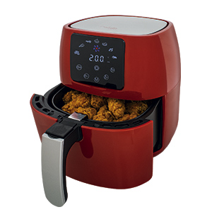 Horkovzdušná fritéza s příkonem 1400W a objemem 3,5 litru. Barva červená, digitální displej s přednastavenými programy.